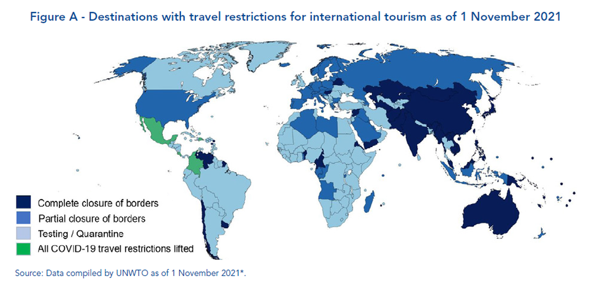Según un informe de la Organización Mundial del Turismo (OMT), 46 destinos (el 21% del total) tienen actualmente sus fronteras completamente cerradas a los turistas. De ellos, 26 las han mantenido bloqueadas al menos desde finales de abril de 2020. Otros 55 (el 25%) tienen sus límites parcialmente cerrados al turismo internacional, y 112 destinos (el 52%) exigen a los viajeros que presenten una prueba PCR o un test de antígenos a su llegada.